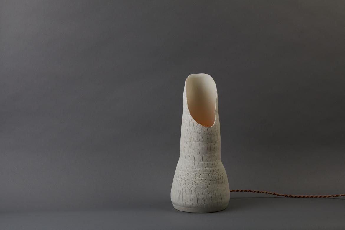 Inspired by the beauty of a dried-out desert lake bed, each piece is a handmade one-of-a-kind object that produces a mysterious quality when internally lit, embracing the flaws and accidents inherent in the craft and process of making: the series exemplifies the wabi-sabi ethos of acceptance of transience and imperfection.